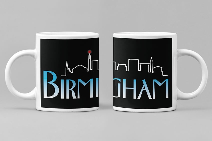 This exclusive design features the Birmingham skyline in sleek white against a jet-black background, complete with the BT Tower cheekily lit up in red – just like that little dot over the Seattle Space Needle. Underneath? A bold, stylised “BIRMINGHAM” in gradient blue and white, oozing retro sophistication and local love.